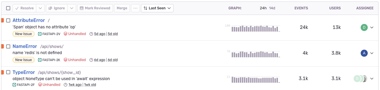 The following information about your FastAPI project will be available to you on Sentry.io: