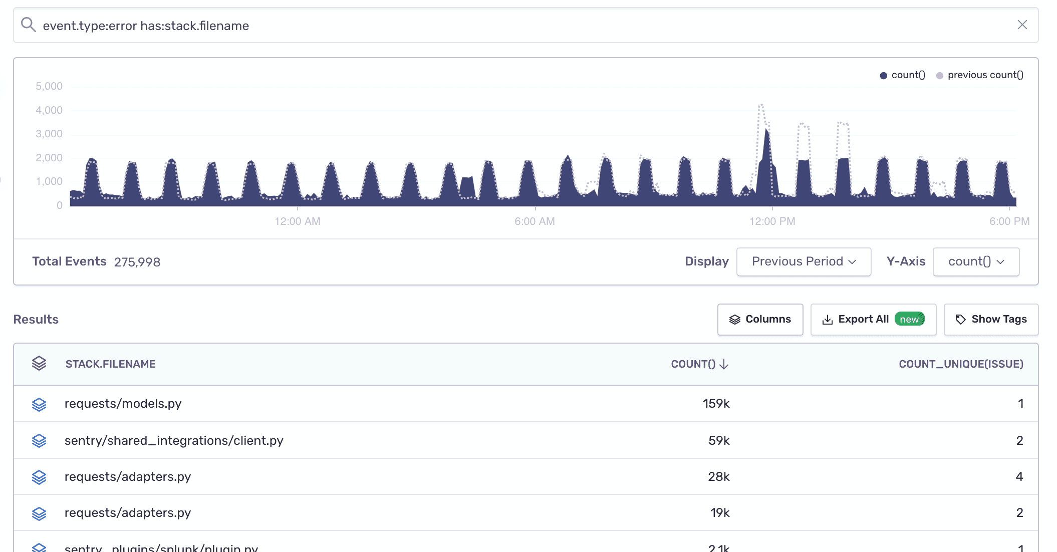 From here you can add a release as a filter and change the columns to count() and title to see similar errors. Then you can click the "Open Group" icon to drill down to individual events. You can also open the release in Releases from the "Results" table.