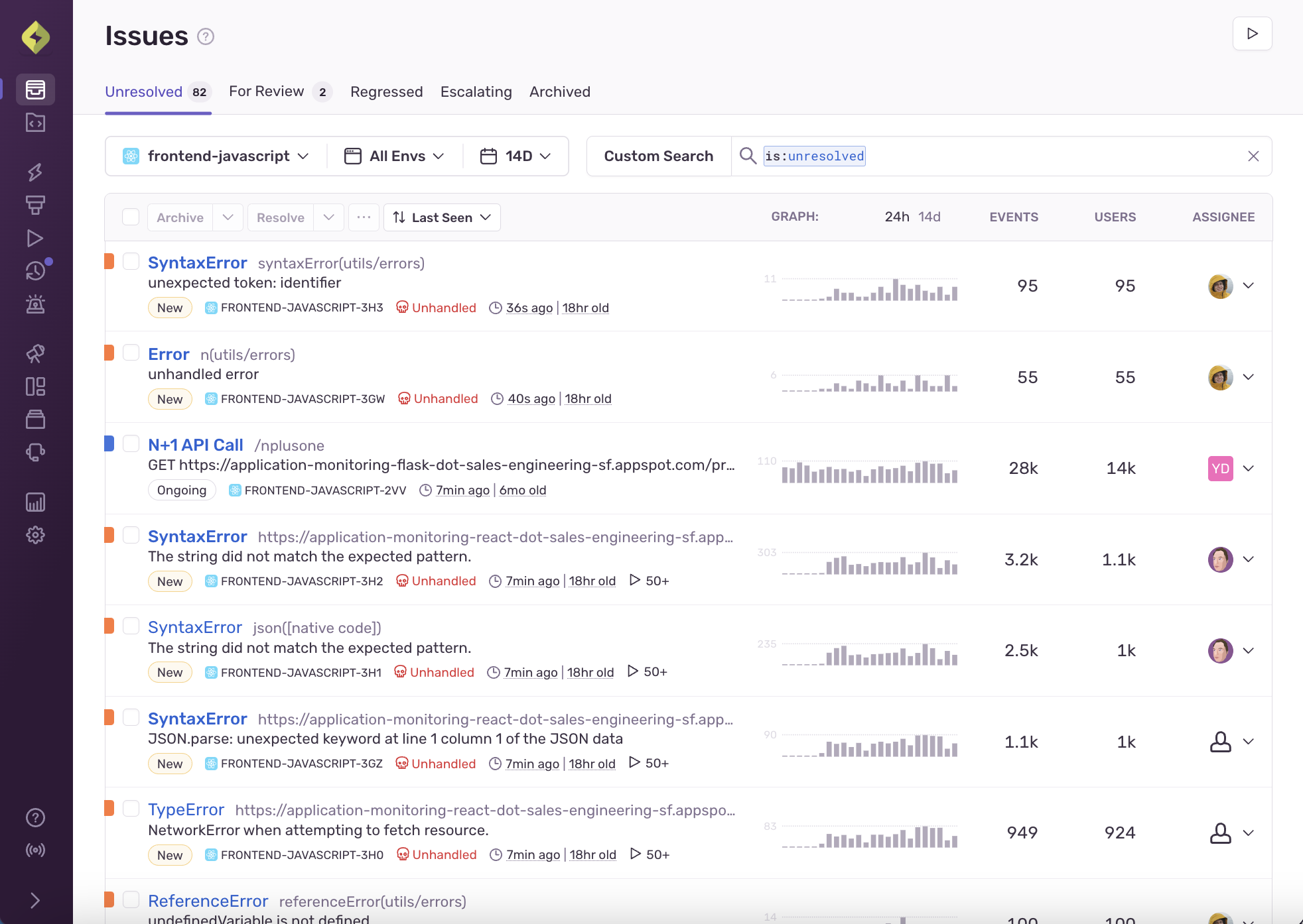 - Events: Issues are sorted by total event volume.
