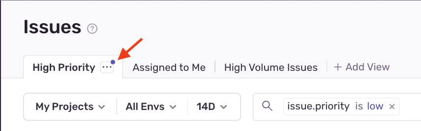 Issue views let you customize what shows up in your issue stream so you can quickly see what's most important to you. You have full control over which search query your issue stream renders by default, and which other queries are within a click's reach.